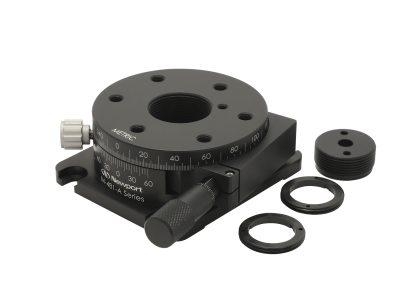 ステージの側面には、1度刻みの目盛のついたスケールと、5分刻みのバーニアスケールが付いています。モデル481-Aには、分解能の高い80ピッチのAJS微調スクリューを使用したバージョンもあります。モデル481-Aは、ベースの切り欠き穴を利用してテーブルまたはブレッドボードに取り付けます。ポストに取り付ける場合は、ステージ側面の2つのタップ穴の1つを使用します。また、481-Aには直径1インチ (25.4 mm) のリテーニングリングが2つと、部品 (ポストホルダなど) をマウントするための中央に通し穴のあいたインサートも付属品として付いています。